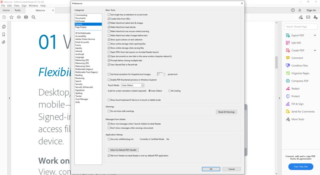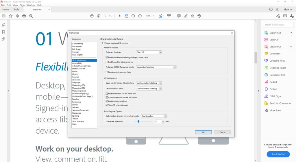 設定を変更して、ツールを好みに合わせてカスタマイズできます。[環境設定] をクリックして、コメント、3D とマルチメディア、測定と読み取り、スペル、ページ単位の構成などをカスタマイズします。さらに、CreatePDF は、お気に入りのファイルを PDF 形式に変換するためにも使用できます。